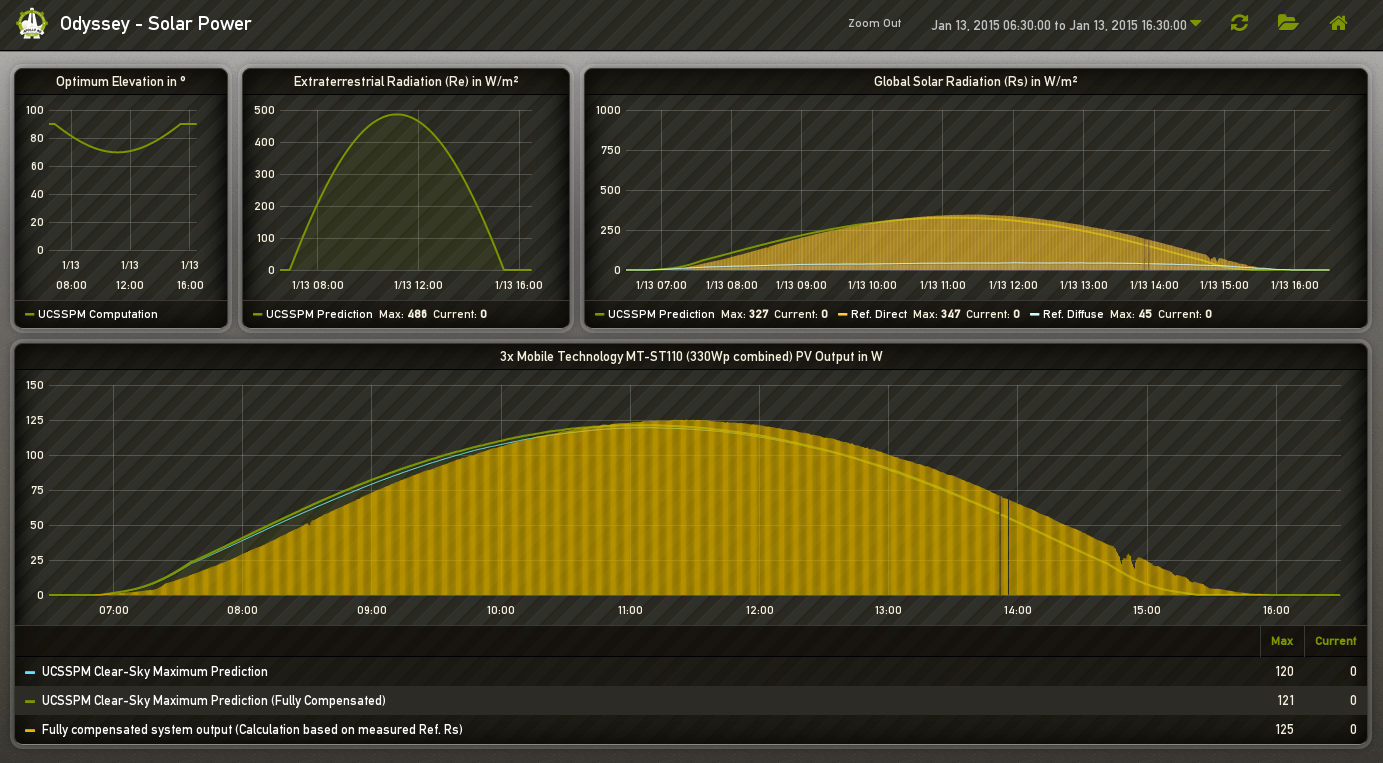 The top right graph shows global solar radiation over a 10 hour period. The green line shows what the UCSSPM predicted as a maximum clear-sky value, the yellow bars show the reference measurement of global solar radiation in W per m² over the same period. The bigger graph at the bottom shows how that translates into the context of photovoltaics (conversion of solar radiation into electricity) and since the output is always a derivative value of global solar radiation the graph looks about the same but the output is measured in W. We can see that we are a long way off the 800-1000 W/m² which are often used for baselining. Of course, it cannot predict the weather but it is an enormous help in planning, scaling and operating solar energy conversion systems in order to have a reliable baseline, so that we know what could be obtained as a maximum at a specific location/time, when there are no clouds.