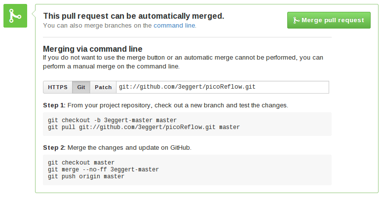 Github also offers some command line foo for this, as you can see in the screenshot above but I'd like to use this opportunity to share another way how to test, handle and merge github pull requests even more easily and comfortably, in case you're new to git/github and don't know about this yet in a real-world, step-by-step example.