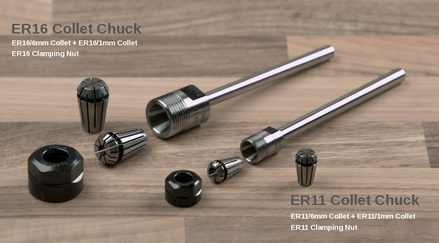 After a preliminary review, the first prototype will be built with the more massive ER16 collet-chuck, since the threading will probably survive longer and the collets also seem to be more heavy-duty than the ER11.